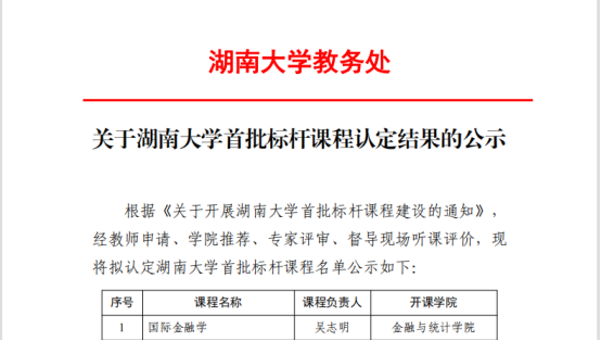 近日,学校首批标杆课程认定结果公布,全校共5门,其中漫蛙漫画 吴志明老师负责的《国际金融学》被认定为漫蛙漫画 首批标杆课程。