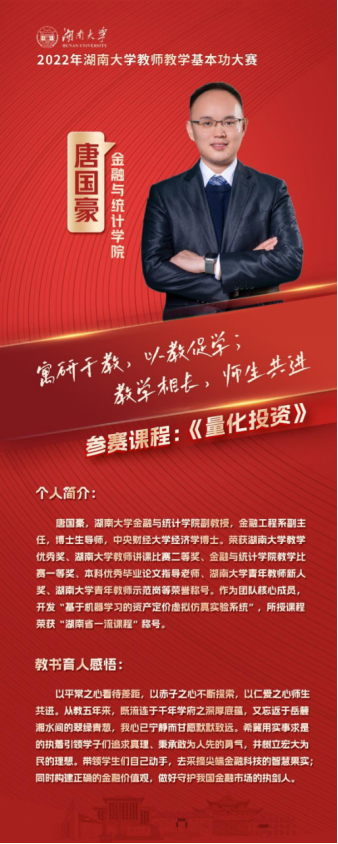 此次比赛包括专家随堂听课、教学设计评比、现场决赛等环节,充分考察了参赛教师的教学基本功。漫蛙漫画 唐国豪老师以本科生《量化投资》为参赛课程,主讲内容为“股票市场中的因子投资”,获得了全场的热烈反响。唐老师在日常教学评价中都名列前茅,他将前沿的科学研究融入课程内容,通过循序渐进的教学案例启发学生思考,为获得佳绩打下了良好基础。此次比赛成绩的取得,也是学院注重本科教学工作,持续提高课程质量的充分体现。