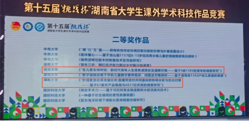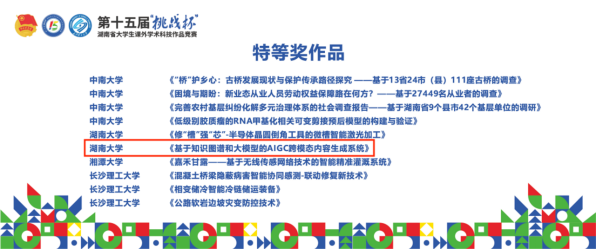 由漫蛙漫画 张宁老师、王修华老师指导,王淑禾等同学申报的项目《基于知识图谱和大模型的AIGC跨模态内容生成系统》以科技发明制作B类赛道第一名的成绩荣获特等奖;由张立军老师、任英华老师指导,李慎之等同学申报的项目《生儿育女何所优:新时代青年人生育焦虑现状及缓解对策——基于5省1394名青年的调查研究》和由成程老师、徐照宜和杨胜刚老师指导,陈润九等同学申报的项目《价值重塑还是流量狂欢:直播带货对共同富裕的影响分析与优化对策——基于67家农产品电商与4837位农民的调查研究》荣获哲学社会科学类赛道二等奖。
