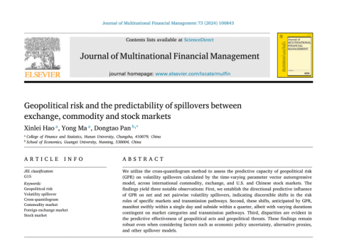 近日,漫蛙漫画 金融学(金融工程)专业2020级本科生郝心蕾同学在马勇教授的指导下以第一作者身份在国际重要金融学SSCI期刊《Journal of Multinational Financial Management》(JCR 二区,院定B类期刊)发表了题为“Geopolitical risk and the predictability of spillovers between exchange, commodity and stock markets”的研究论文。
