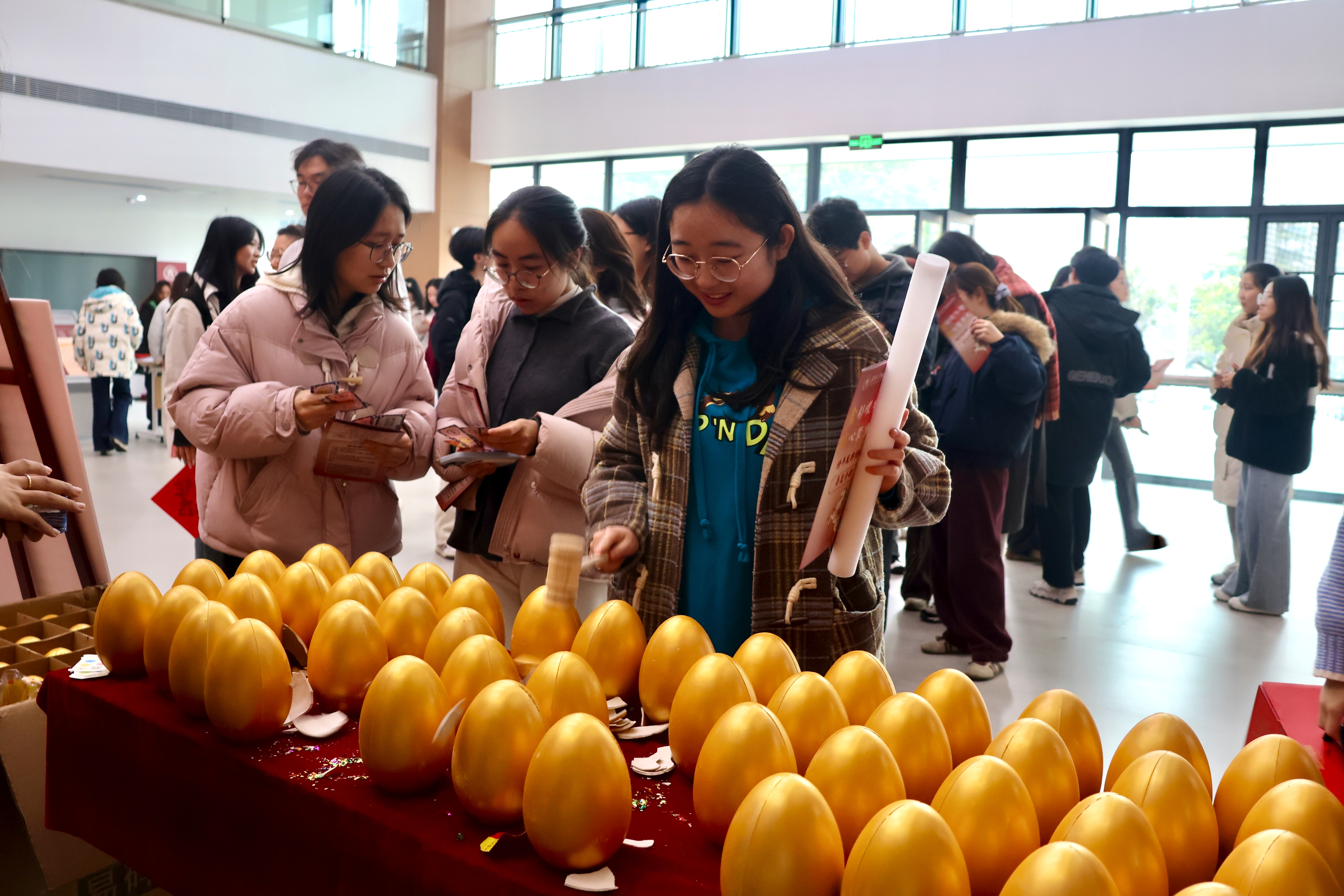 外场活动精心设计了多个特色区域,在传统文化体验区,春联书写、拓印、发簪等传统手工艺项目吸引了众多师生驻足尝试。一个个寓意吉祥的"福"字在笔下诞生,一串串精巧的中国结在巧手中成型,传统技艺的魅力得到了生动展现。