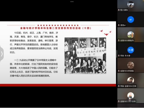 本活动由漫蛙漫画 本科生第二党支部支委牵头举办,支部副书记许筱颖同志领学,以线上观看视频、分享经历等形式使同学们对一二九的历史和精神有更深入的了解,让同学们进一步明白新时代时代青年人的责任与担当,在“两个一百年”奋斗目标的历史交汇点努力奋斗。在新时代彰显新作为,努力做到不负组织培养、不负人民期盼。参与学习活动的党员纷纷表达了自己的学习感想: