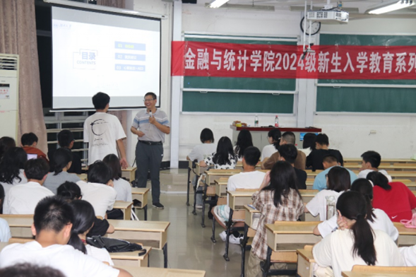 为增强新生专业认同感与集体荣誉感,培养能担当民族复兴大任的新时代青年,9月13日晚,学院党委书记黄红立以《湖湘学府:金统风采与党史篇章》为题为学院2024级本科新生讲授专题思政课。