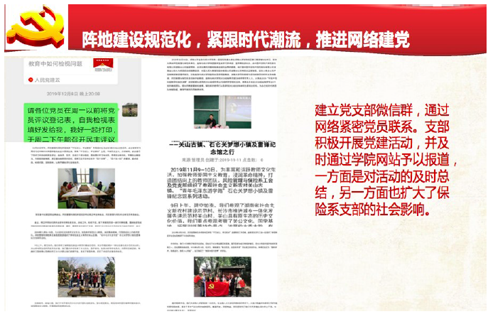 着力在全体保险系教职工思想工作中起到凝心聚力和政治引领作用,加强党的建设,落实三会一课的执行,规范党的组织生活,教学、科研工作中党员先锋模范作用突出,思想政治工作针对性和亲和力强,以基层党建带动教学科研杰出人才的培养,在教学、科研、管理、社会服务等领域取得优异成绩。保险学专业被评为湖南省一流本科专业建设点,精算学本科专业获批。