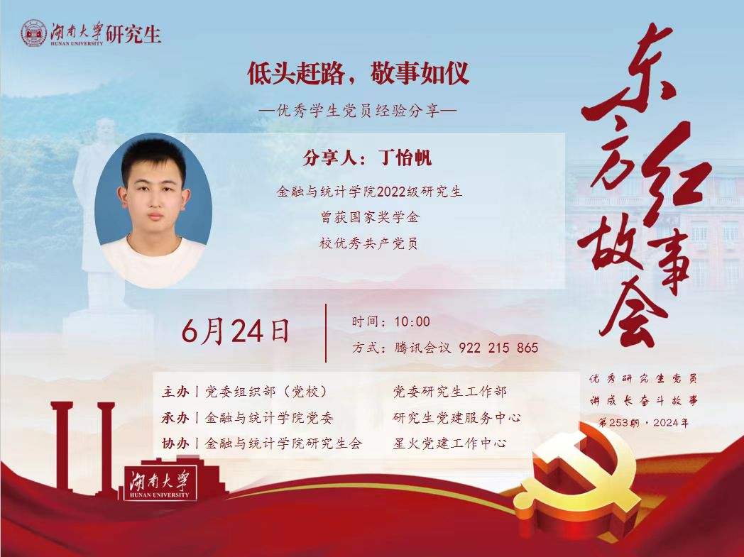 多年科研的训练,让丁怡帆能够有规划的、条理清楚地展开党支部工作。面对繁杂的党建工作,丁怡帆会在工作之初明确和规划好一年党支部的关键工作任务。他努力将金融专业特色融入支部党建工作,以观影、座谈和科研分享等形式组织各类党建活动,确保活动既能激发兴趣,也让大家在轻松氛围中获得启发。丁怡帆也因此获得漫蛙漫画 优秀党员荣誉称号。