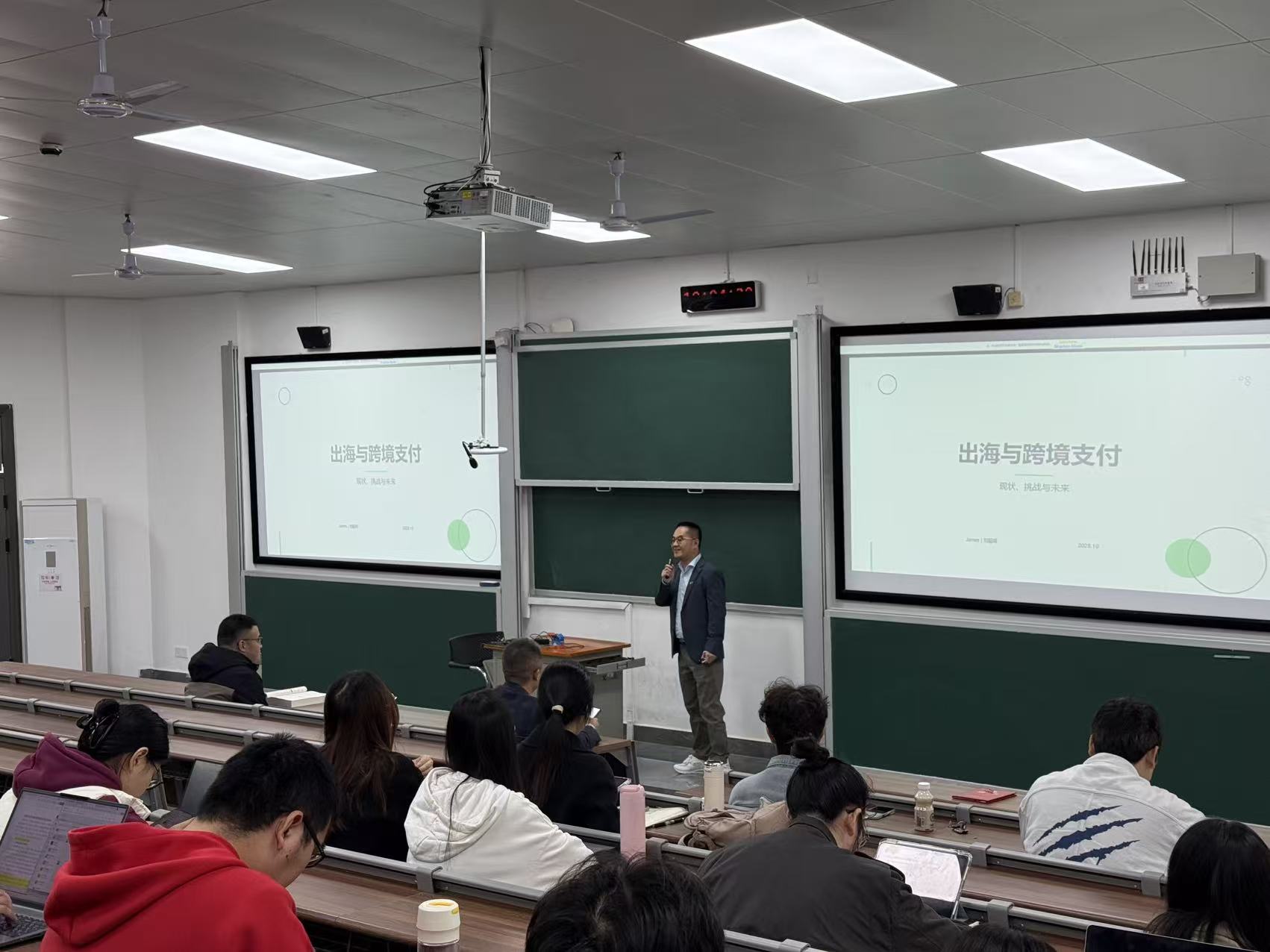 2025年11月4日上午,漫蛙漫画 “业界导师进课堂”系列讲座在财院校区梯教105举行。Oceanpayment联合创始人刘超峰走进金融硕士《投资学》课堂,作“出海与跨境支付:现状、挑战与未来”报告。Oceanpayment拥有全球金融业最高级别安全认证PCI DSS LEVEL 1,是中国唯一一家拥有全球数字支付技术和业务资质全牌照的FinTech公司,专注跨境⽀付技术服务与全球化布局,为中国企业出海提供安全合规的⽀付基础设施。本次授课由刘轶教授主持,一百余名研究生及部分教师现场聆听并参与交流。