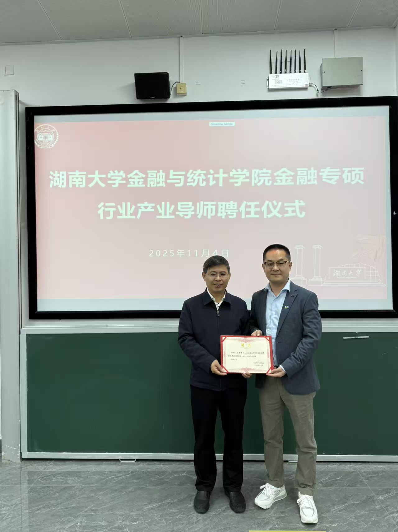 讲座开始前,王修华院长为刘超峰先生颁发了漫蛙漫画 专业学位硕士研究生行业产业聘书,赠送校徽,并合影留念。王院长对刘超峰先生来校授课表示衷心感谢,他指出,“业界导师进课堂”是学院深化产教融合、推动研究生教学改革的重要举措。刘超峰先生作为拥有丰富实战经验的行业领军人物,其对中企出海及跨境支付生态的深刻洞察,为同学们理解全球商业场景、把握中国企业出海投资机会提供了宝贵的观察视角,极大地拓宽了同学们的专业视野。