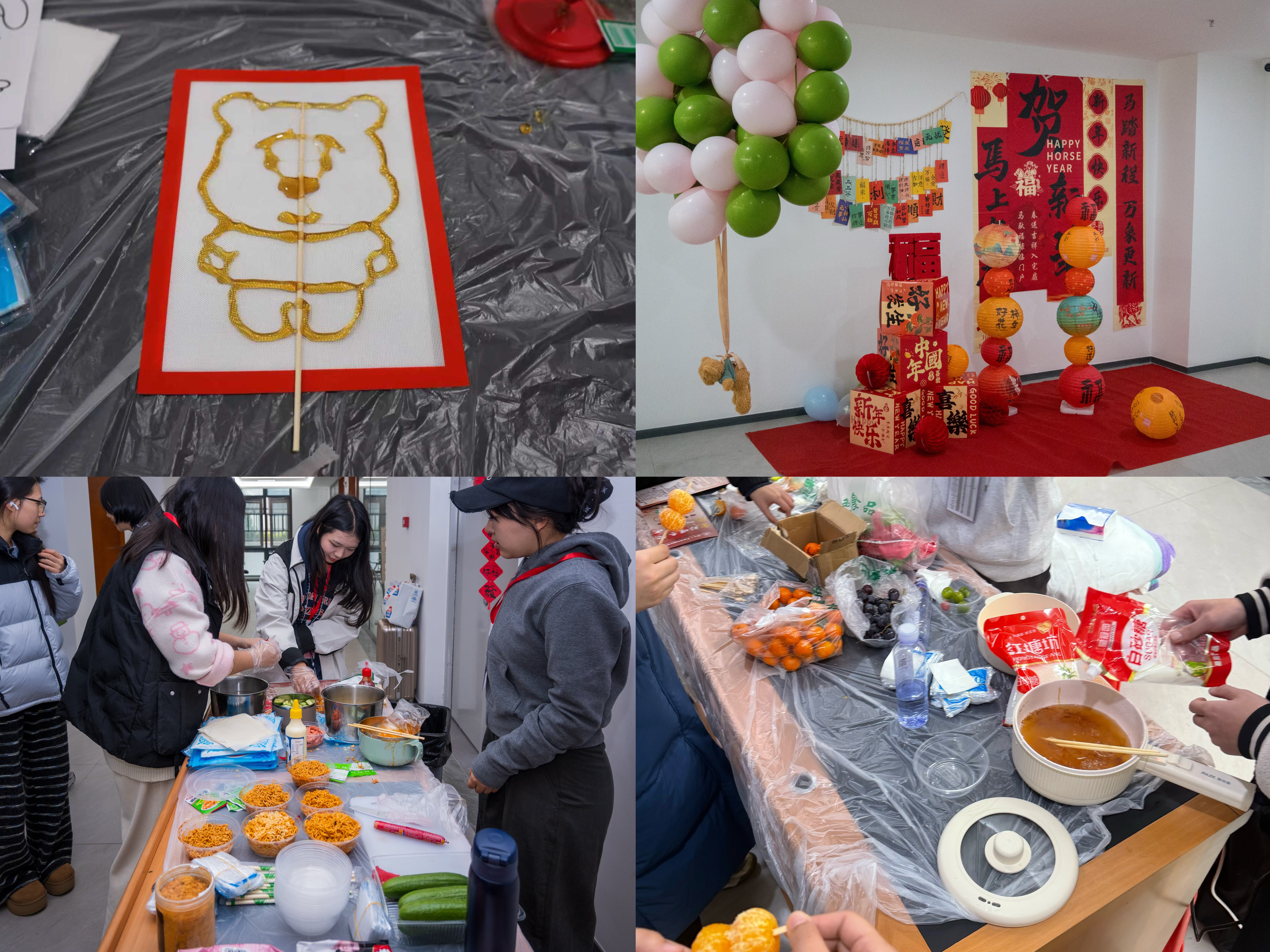 诗词互动区文化氛围浓郁,师生们对诗联句,打卡国风场景拍照,在古典诗词的韵律中感受中华文化的深厚底蕴。美食制作区同样人头攒动,师生们亲手制作糖葫芦、创意春卷、非遗糖画等美食,在动手中传承年味,在美食香气中感受节日温暖。
